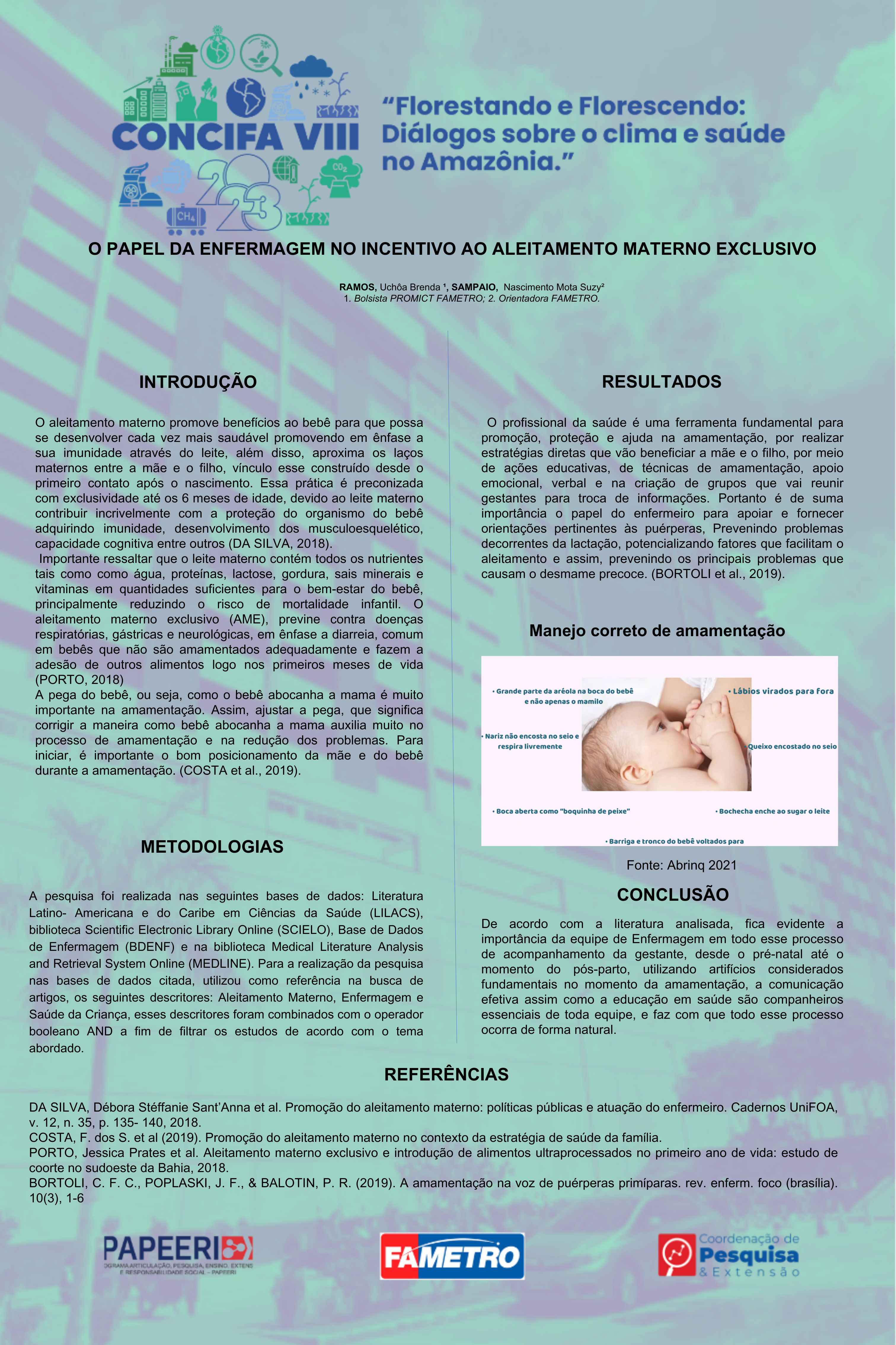 Resultados e discussão: O profissional da saúde é uma ferramenta fundamental para promoção, proteção e ajuda na amamentação, por realizar estratégias diretas que vão beneficiar a mãe e o filho, por meio de ações educativas, de técnicas de amamentação, apoio emocional, verbal e na criação de grupos que vai reunir gestantes para troca de informações. Portanto é de suma importância o papel do enfermeiro para apoiar e fornecer orientações pertinentes as puérperas, prevenindo problemas decorrentes da lactação, potencializando fatores que facilitam o aleitamento e assim, prevenindo os principais problemas que causam o desmame precoce.(BORTOLI et al: 2019)