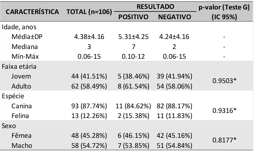 O presente estudo teve como objetivo descrever o perfil epidemiológico e analisar a relação de independência entre as variáveis de estudo e a presença de Anaplasma platys na região centro-sul de Manaus, através de amostras sanguíneas enviadas ao Laboratório Veterinário Amanda Danin, avaliadas por meio de esfregaço sanguíneo. Na análise estatística utilizou-se testes de medida central e medidas de frequência absoluta, relativa e teste G de independência. As variáveis de interesse para esse estudo foram espécie, idade e sexo. Das 106 amostras analisadas, 13 apresentaram resultado positivo. Foi avaliada a relação de independência entre as variáveis e o resultado para Anaplasma platys, onde se mostrou superior a p=0,05. O perfil epidemiológico não apresentou valores significativos entre as variáveis, porém a maioria dos casos foi entre pacientes de espécie canina, adultos e machos. Não houve uma associação significativa entre casos positivos e negativos.