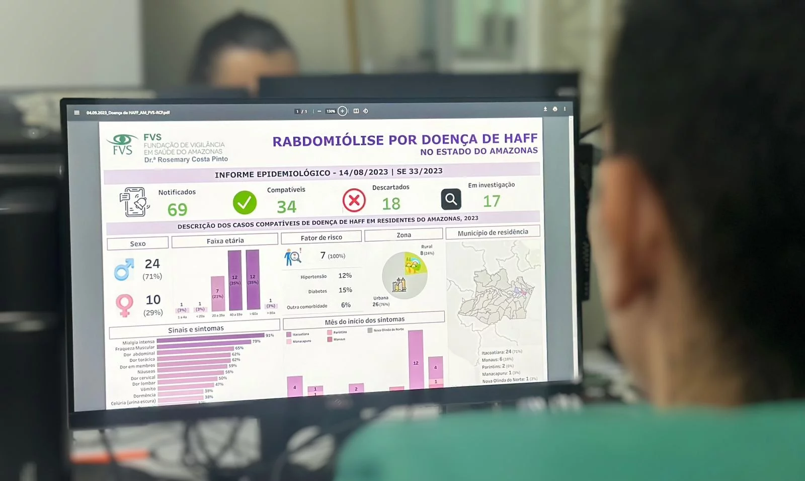 O presente estudo analisou casos de Doença de Haff no Amazonas entre 2021 e 2023, utilizando dados de boletins epidemiológicos e informes semanais da Fundação de Vigilância em Saúde do Amazonas. A pesquisa focou na faixa etária e sexo dos pacientes afetados, utilizando análise descritiva. Os resultados revelaram variações nos casos, com um pico em agosto, e diferenças demográficas, incluindo a predominância de pacientes do sexo masculino. Itacoatiara foi o município mais afetado. Contudo, é necessário reforçar a inclusão de políticas públicas de saúde específicas e conscientização para mitigar os riscos da ingestão de peixe sem procedência.