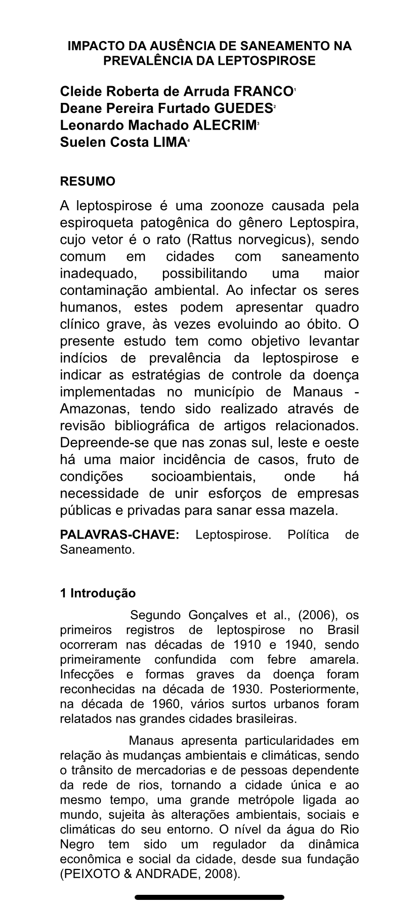 A leptospirose é uma zoonose causada pela espiroqueta patogênica do gênero Leptospira, cujo vetor é o rato (Rattus norvegicus), sendo comum em cidades com saneamento inadequado, possibilitando uma maior contaminação ambiental. Ao infectar os seres humanos, estes podem apresentar quadro clínico grave, às vezes evoluindo ao óbito. O presente estudo tem como objetivo levantar indícios de prevalência da leptospirose e indicar as estratégias de controle da doença implementadas no município de Manaus – Amazonas, tendo sido realizado através de revisão bibliográfica de artigos relacionados. Depreende-se que nas zonas sul, leste e oeste há uma maior incidência de casos, fruto de condições socioambientais, onde há necessidade de unir esforços de empresas públicas e privadas para sanar essa mazela.