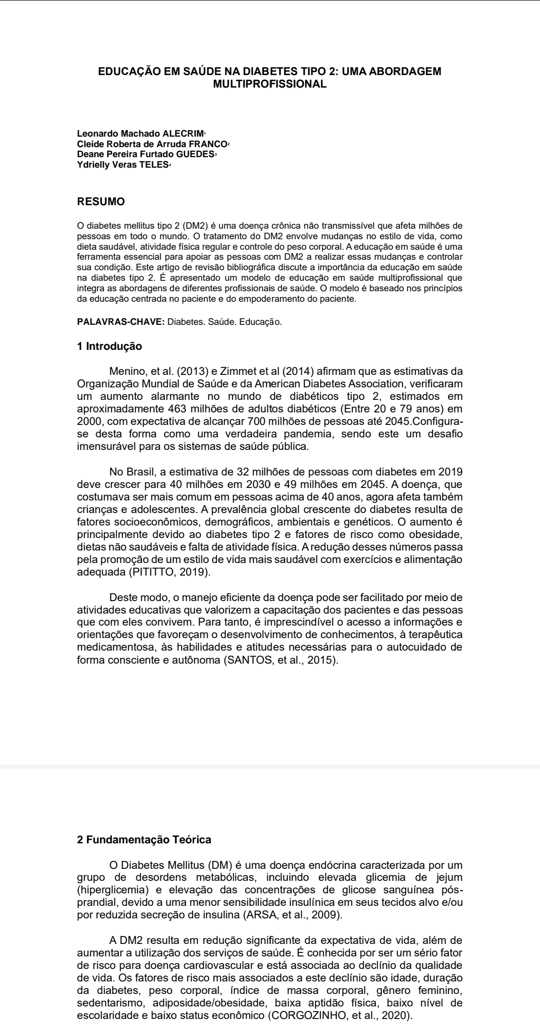 O diabetes mellitus tipo 2 (DM2) é uma doença crônica não transmissível que afeta milhões de pessoas em todo o mundo. O tratamento do DM2 envolve mudanças no estilo de vida, como dieta saudável, atividade física regular e controle do peso corporal. A educação em saúde é uma ferramenta essencial para apoiar as pessoas com DM2 a realizar essas mudanças e controlar sua condição. Este artigo de revisão bibliográfica discute a importância da educação em saúde na diabetes tipo 2. É apresentado um modelo de educação em saúde multiprofissional que integra as abordagens de diferentes profissionais de saúde. O modelo é baseado nos princípios da educação centrada no paciente e do empoderamento do paciente.